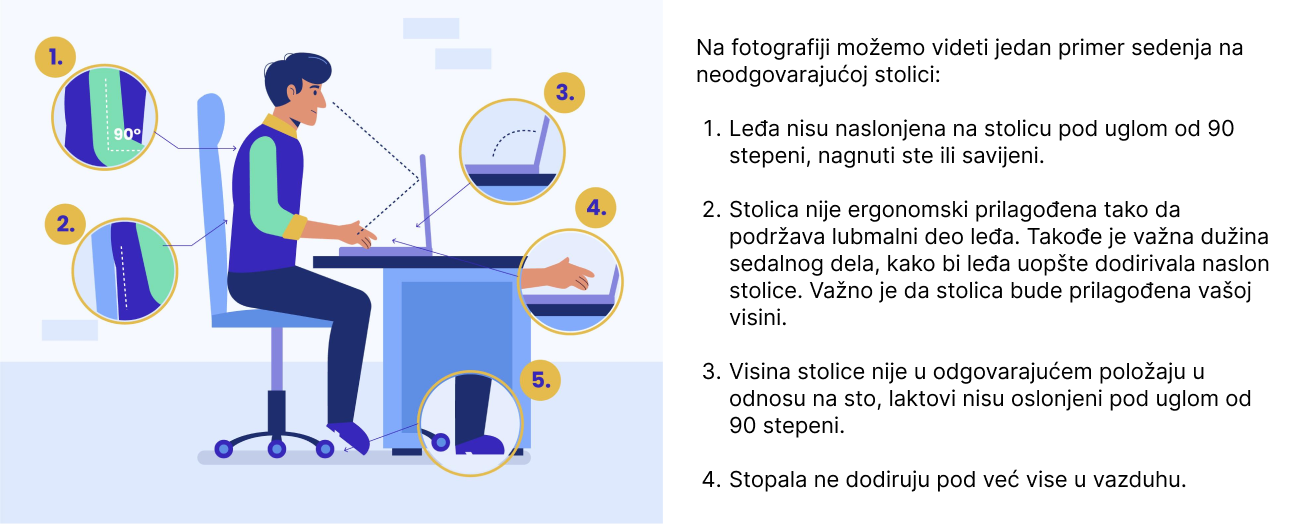 Prilagodljiva visina stolice: Jako je važno da visina stolice i stola budu usklađene i adekvatne vašoj visini. Takođe je važno da noge ne vise već da dodiruju (tj. da se oslanjaju) na pod.